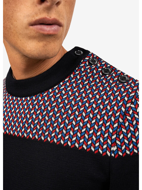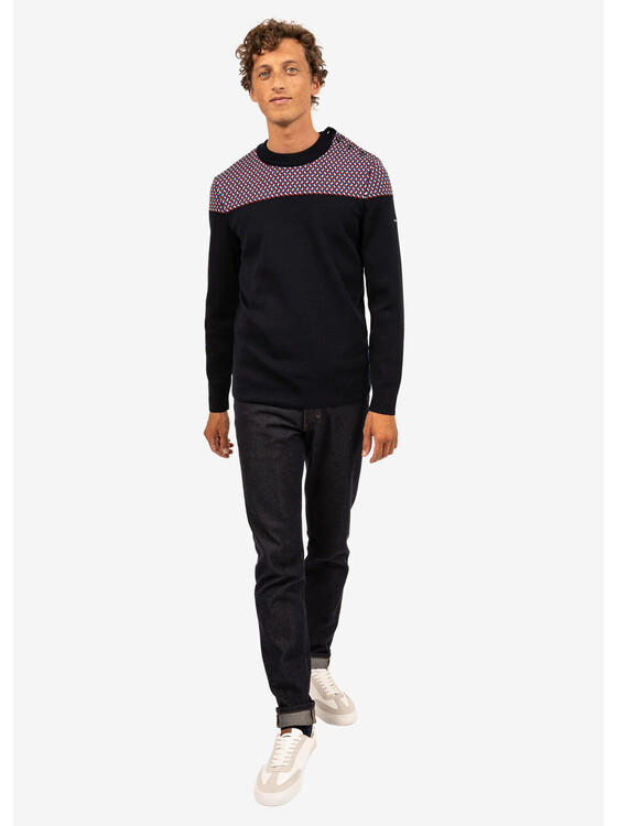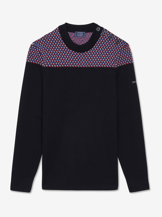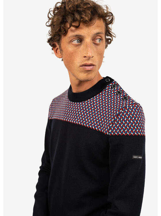 Knitted in the Normandy workshops of Saint James, this round-neck sailor sweater features a contrasting jacquard yoke at the top of the body as well as a button placket on the left shoulder. A piece inspired by iconic, timeless sailor sweaters.