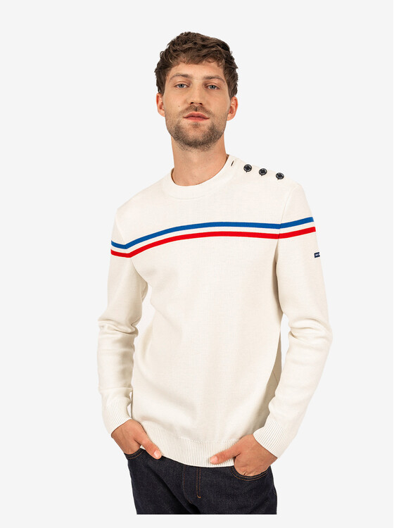 The Drapeau Elysée sweater is a wool sweater, knitted in the Norman workshops of SAINT JAMES. It features the iconic French Blue/White/Red with its stripes placed on the chest. At the bottom of the body, a ribbed edge provides comfort and volume.