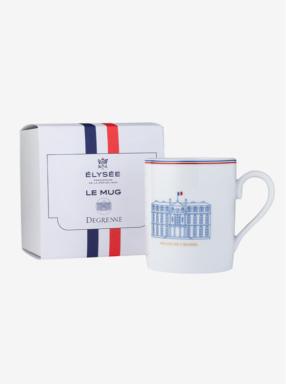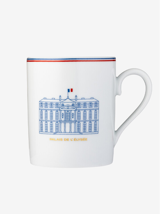 This exclusive mug design, made of authentic Limoges porcelain, is adorned with a blue, white, and red trim and a stunning gold detailing depicting the Élysée Palace and the emblem of the Presidency of the French Republic.