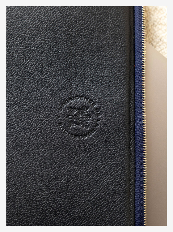 La composition de la pochette d'ordinateur Gabriel est entièrement en cuir de vachette grainé pleine fleur, avec doublure moussée, ce qui lui confère une qualité irréprochable ainsi qu'un toucher doux très agréable. Le design original se dessine à travers sa sobriété les divers éléments, arborant le logo de la République Française et la cocarde Larmorie.