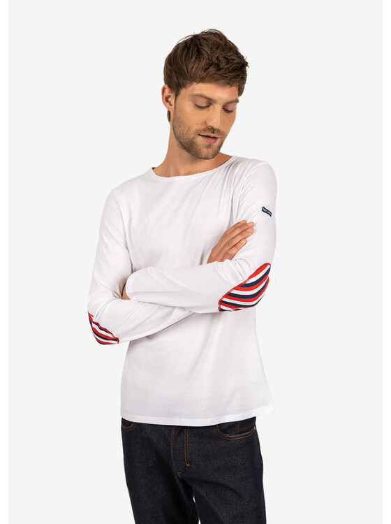 Simple et confortable, ce t-shirt à manches longues est confectionné en coton dans les Ateliers normands de SAINT JAMES. Aux manches, un détail de coudières rayées reprenant les couleurs de la République Française ajoute une discrète touche de fantaisie à ce modèle basique et polyvalent.
