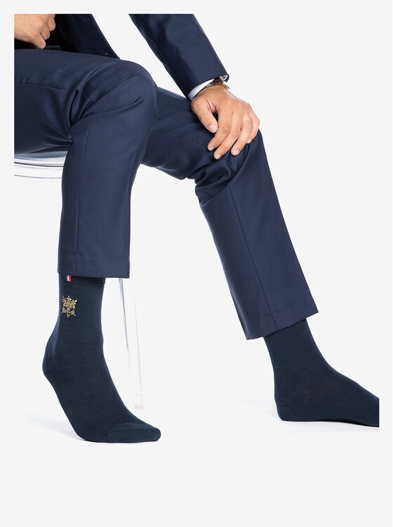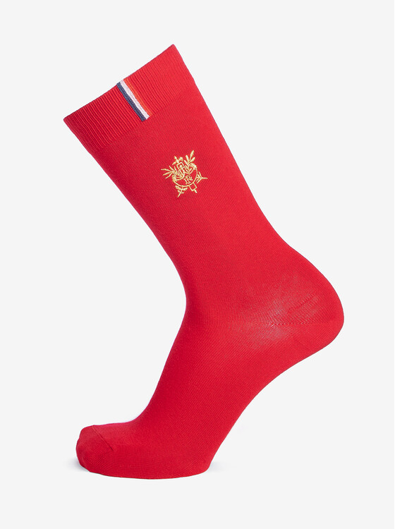 Mi-chaussette en coton, coloris marine et rouge avec broderie dorée du sceau de la Présidence de la République.
