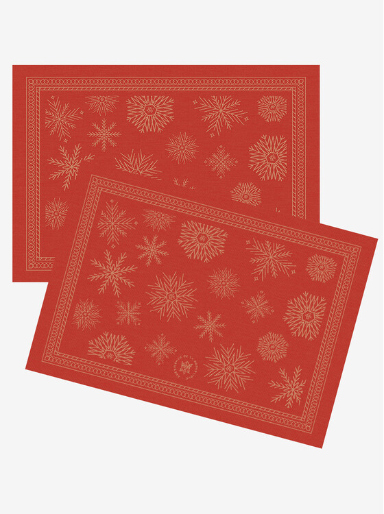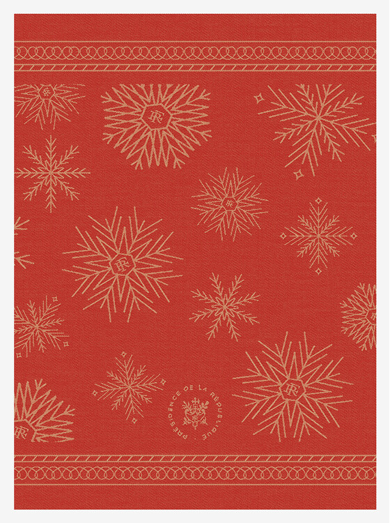Elle invite à célébrer l’art de recevoir à la française, entre élégance intemporelle et esprit de convivialité, à travers une collection exclusive de linge de table festif aux rouges profonds et ors étoilés, complété de tabliers, essuie-mains et torchons évoquant le charme des villages d’hiver.